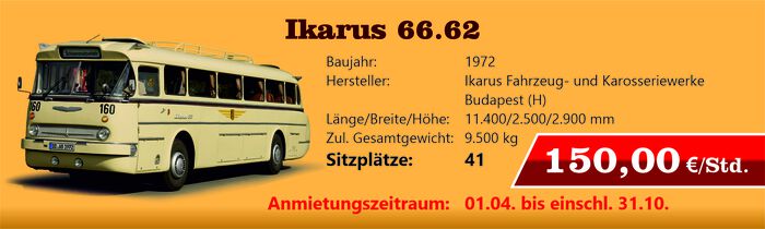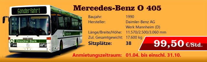 Bitte beachten Sie bei Ihrer Anfrage/Kalkulation/Bestellung, dass die Busse für eine Dauer ab mindestens 2 Stunden gebucht werden können. Im Sinne der Rechtsvorschriften bieten wir keine Stehplätze an. Zum Anmietungspreis werden jeweils die Auf- und Abrüstzeiten, die An- und Rückfahrt vom bzw. zum Betriebshof sowie die Wartezeiten zuzüglich berechnet.